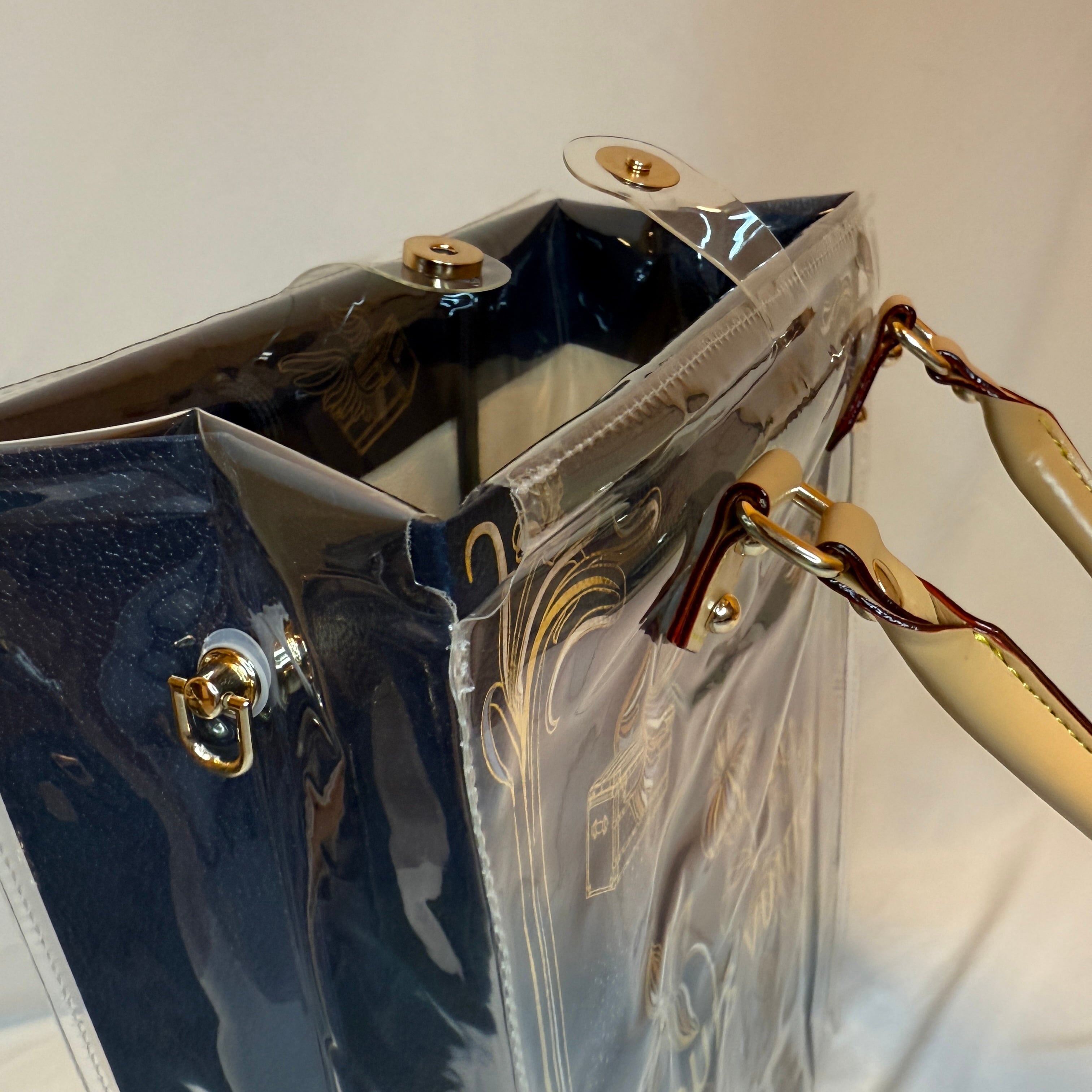 クリアバッグのハンドルはベージュの合皮で、